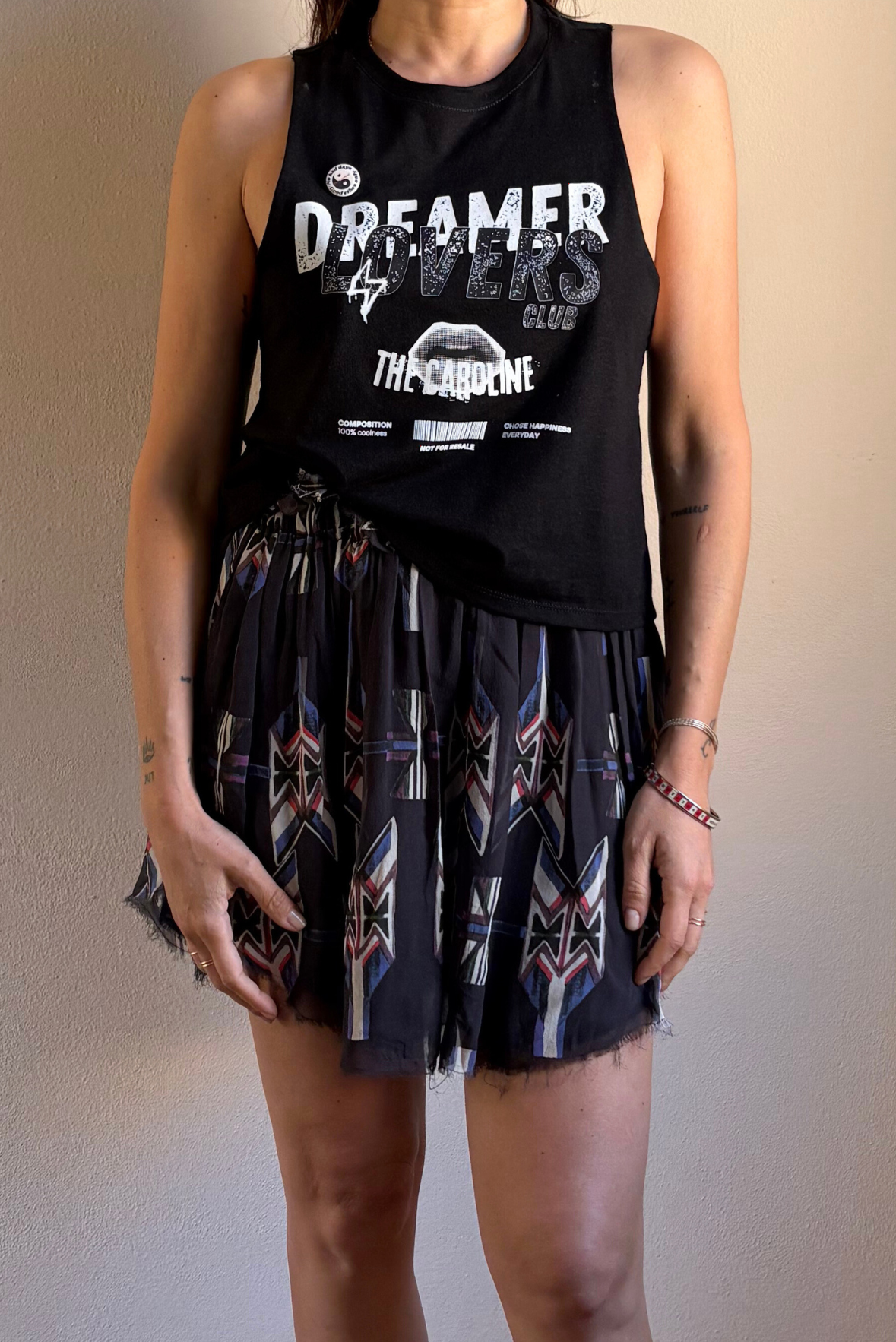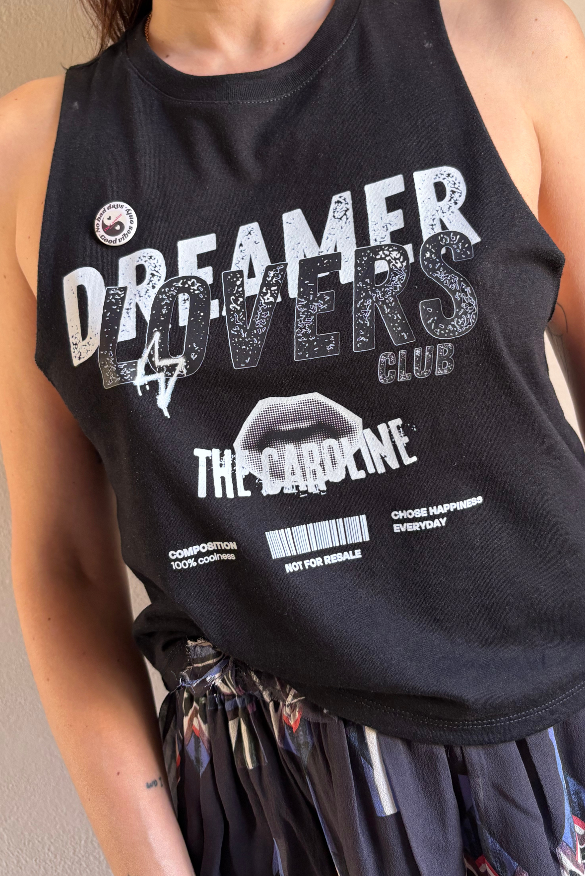 Top stampa "DREAMER LOVERS" in cotone. Taglia indossata S su una 42IT. Composizione 100% cotone. Spilla con logo rimovibile. Stampa a mano digitale.